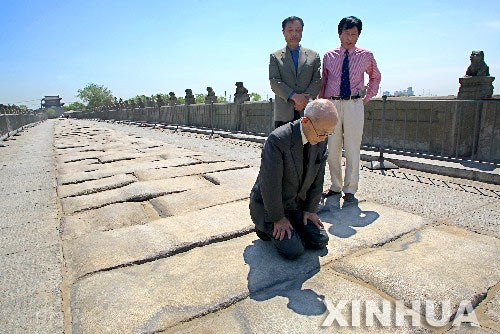 5月19日上午10点45分,一位来自日本的耄耋老人,缓步走上因久经风霜而凹凸不平的北京卢沟桥桥面。在桥的中间,他突然双膝跪下,面向西南,默然垂首。 他就是91岁的日本侵华老兵本多立太郎。他以下跪的方式,为自己在60多年前那场战争中的罪行向中国人民谢罪。 这是本多立太郎跪在“七·七事变”的发生地卢沟桥上,他身后站着中国人民抗日战争纪念馆馆长王新华(左)和《我认识的鬼子兵》作者方军。 新华社发(贺延光 摄)