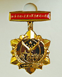 纪念中国人民抗日战争胜利60周年纪念章图样,纪念章正面铸有象征中国共产党领导的革命人民大团结的5颗五角星,象征人类和平的鸽子和橄榄枝,象征革命圣地的延安宝塔山,以及军民合力抗战的战斗场面。